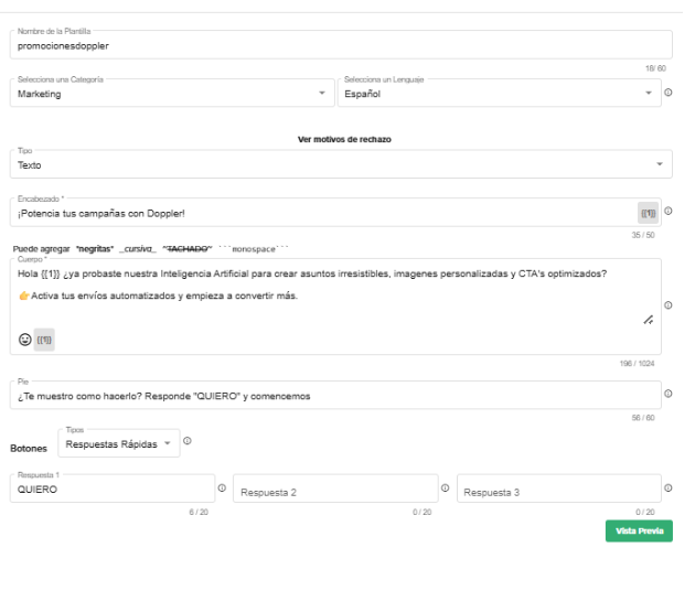 💡 #DopplerTip: Use the Preview button to see how your message will look before sending it to Meta for approval.