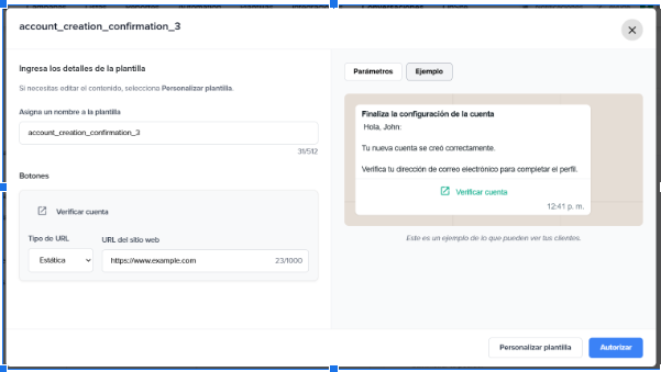 - Customize template: if you want to adjust the body of the message, this option redirects you to the template editor, where you can make changes and then authorize its creation.