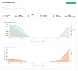 From this panel, you can access key metrics such as deliveries, opens, Clicks, bounces and unsubscribes, all of which are represented in dynamic graphs that make it easy to spot trends in seconds.