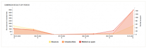 Lower graph: shows the metrics for Bounces, Unsubscribes, and Marked as Spam, helping you detect possible alerts or variations in the quality of your Lists.