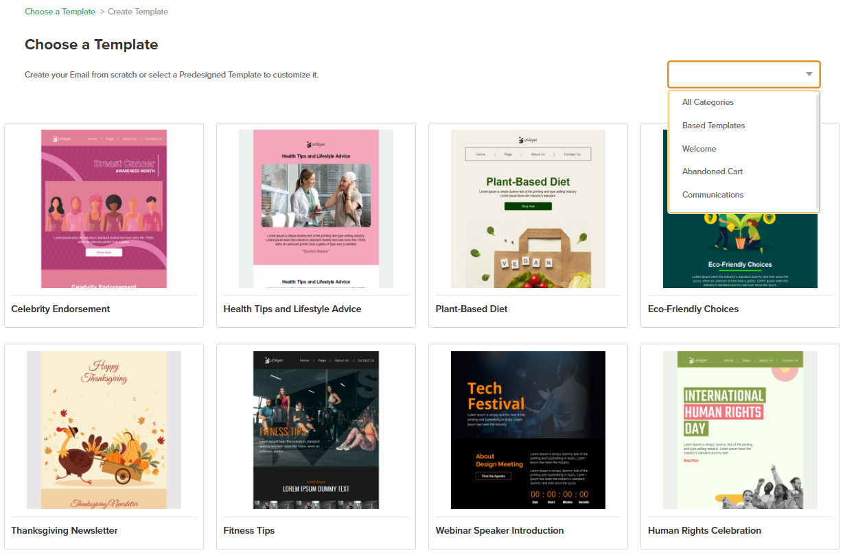 When you access Templates (as shown in the first image), you can either edit an existing template or proceed to “Create a template”. As you move forward to create a template, you’ll find various options organized into categories. Among the most prominent ones are: “Events”, “Communications”, “E-commerce”, “Welcome” and “Abandoned Cart”.