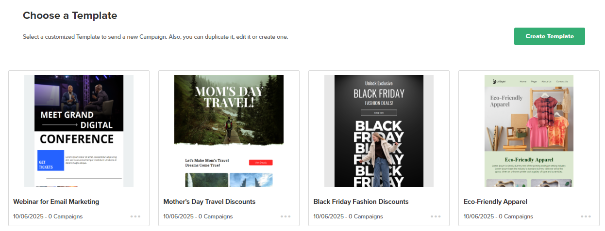 In this option it is possible to choose between several pre-designed templates or create one from scratch by clicking on “Create template”.