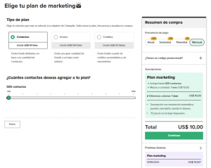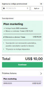 Importante: los beneficios no son acumulables. Por eso, en el caso de que selecciones un «Plan por Contactos» y quieras abonar 3, 6 o 12 meses por anticipado, no podrás usar un código de descuento, ya que esa opción tiene por defecto beneficios asociados. Entonces, la caja para introducir el código de descuento no aparecerá.