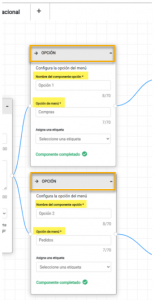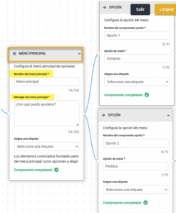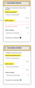 Ambas opciones permiten al cliente volver al menú de opciones para volver a elegir otra opción en caso lo requiera. También deberás configurar un nombre del componente y la opción a mostrar.