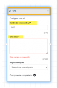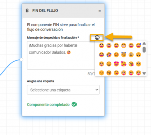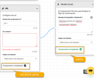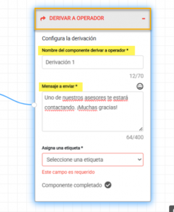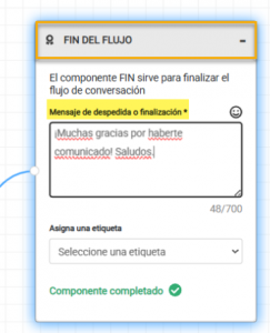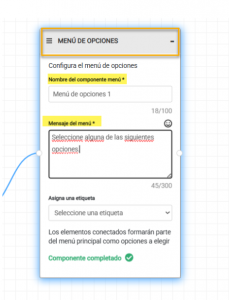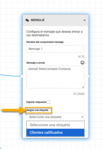 • Etiquetas: algunos componentes permiten asignar etiquetas. Si la persona avanza por esa rama, se le asignará la etiqueta configurada y podrás etiquetar chats para ordenar la atención del equipo.