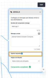 • Si no se selecciona pausar bot, funciona como el componente fin de flujo. Si el cliente inserta la palabra clave que definiste, el flujo vuelve a comenzar.