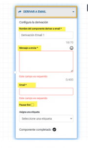 Este componente te envía por Email toda la interacción que el cliente ha tenido con el bot, para que puedas tener un registro de ello. Esto va desde el inicio de datos requeridos hasta que llegó a este componente.