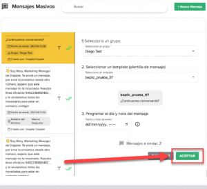 ¿Cómo crear una Campaña de mensajes masivos por WhatsApp? ¿Sabías que puedes realizar envíos masivos a través de WhatsApp? Esta opción permite programar campañas de mensajes para aumentar tu alcance y reducir el tiempo de gestión. Veamos cómo realizarlo 🙂 Para comenzar, ingresa a tu cuenta en Doppler y luego dirígete a la opción Conversaciones. En el menú lateral de la izquierda, selecciona Mensajes Masivos aquí es donde podrás administrar todos los mensajes masivos que necesites enviar o que ya tengas creados: En esta opción también podremos ver la lista de mensajes masivos programados o puedes editar un mensaje si es que todavía no se ejecutó o bien visualizar si es que ya se ejecutó. Ahora, para poder crear una nueva Campaña masiva, debes hacer clic en “Nuevo mensaje”: Una vez allí podrás comenzar a configurarla y seleccionar los destinatarios a quien quieres enviarle la campaña, la plantilla que vas a enviar y el día y horario en el que quieras que salga: 2. Luego, debes seleccionar cuál es la fuente de los contactos, template del mensaje y programación de envío. Los grupos a los que se envían pueden ser a través de la creación de tus GRUPOS o bien por EXCEL con un formato particular. Cada opción tiene su particularidad y sus reglas. DopplerTip: En el caso del GRUPO, si quieres saber como poder crear uno, sugiero que veas el artículo titulado: ¿Cómo crear un grupo para Campaña de mensajes masivos de WhatsApp? Cuando completes todos los pasos —elegir la plantilla, seleccionar la sala de envío y definir día y horario (puedes programarlo hasta 5 minutos antes)— solo haz clic en el botón verde “Aceptar” y listo. Tu campaña masiva de WhatsApp quedará programada para enviarse en el momento que definiste. ¿Cómo responder estos mensajes? Una vez enviados y en caso tus contactos te respondan estos mensajes, podrás gestionarlos desde la sección de “Chats”. Simplemente, deberás ingresar allí y hacer clic en la sala de WhatsApp correspondiente: Desde los “tres puntos” podrás filtrar por estado del chat, así como: cerrado – en curso – no vistos – no respondidos – respondidos, según tu preferencia. 😉 ¡Genial! Ahora aprendiste a incluir una Campaña de mensajes masivos para enviar por WhatsApp y hacer aún más eficaz tu comunicación. 🙂 Cualquier duda o comentario, puedes comunicarte con nuestro equipo de Soporte por correo, a [email protected], a nuestro WhatsApp y Chat en línea, o a través de nuestras Redes sociales.