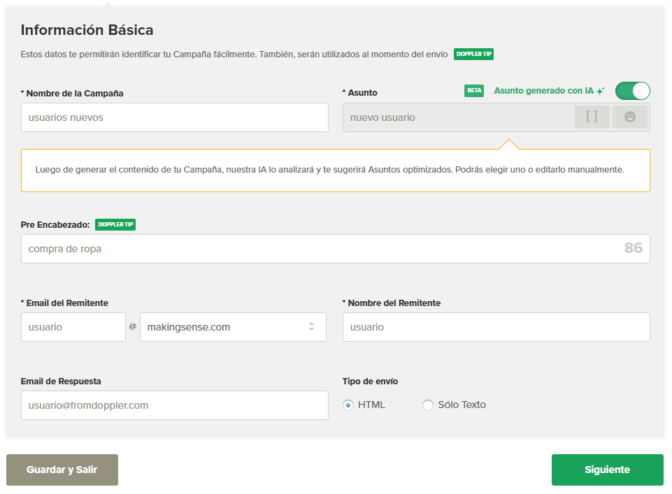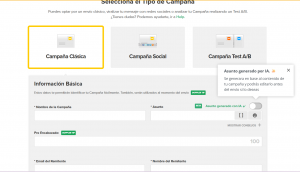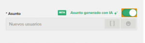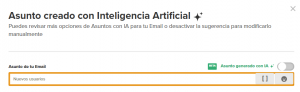 Como utilizar la creación de Asuntos Inteligentes en mis Campañas Al activar la opción de Asunto Inteligente, Doppler utiliza Inteligencia Artificial para generar distintas propuestas de asunto relacionadas con el contenido de tu Campaña, que podrás ver antes de terminar de configurarla. Estas sugerencias buscan: Aportar ideas claras y concretas. Variar enfoques (informativo, promocional, directo, etc.). Ayudarte a encontrar un asunto que capte la atención sin perder coherencia con tu mensaje. A continuación, te damos un paso a paso para que puedas empezar a utilizarlo en tus Campañas. ¿Cómo utilizar Asunto Inteligente? La opción de Asunto Inteligente con IA está disponible durante la etapa de configuración del asunto de la Campaña, dentro del flujo habitual de creación de una Campaña de Email en Doppler. Ingresa a Campañas 2.Elige el tipo de Campaña que quieres realizar: 3.Al completar la información básica de la Campaña, verás una opción específica para generar sugerencias de asunto mediante IA, claramente identificada en la interfaz. 4.Activa asunto generado con IA para que luego, al editar el contenido de tu Campaña, puedas ver estas sugerencias de contenido. 5.Completa toda la información de tu Campaña y haz Clic en Siguiente 6.Selecciona cómo quieres importar el contenido de tu Campaña 7.Una vez configurada, selecciona la Lista a la que quieres impactar con esta Campaña creada Luego elige la forma y el momento de Envío ¡Listo! Ya configuraste tu Campaña, a continuación podrás ver el resumen de la misma Para ver las sugerencias de Asunto Inteligente, tienes que hacer Clic en el icono de Editar, dentro de Asunto Ahora podrás ver todas las sugerencias que la IA tiene para el Asunto de tu Campaña Si prefieres editar el Asunto a tu manera, simplemente tienes que desactivar la generación con IA desde el botón verde. Consideraciones finales El Asunto Inteligente con IA es una herramienta pensada para optimizar tu tiempo y mejorar la calidad de tus Campañas, ayudándote a explorar nuevas ideas y enfoques de manera simple. Te recomendamos probar esta funcionalidad en distintas Campañas y combinarla con tu experiencia y conocimiento de tu audiencia para obtener mejores resultados. Si tienes dudas sobre su uso o necesitas ayuda, nuestro equipo de Soporte está para acompañarte. Escríbenos a [email protected]