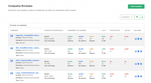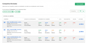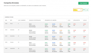 Todo lo que necesitas saber sobre el Reporte de Campañas enviadas El Reporte de Campañas enviadas te permite analizar en detalle el rendimiento de todas las Campañas que ya fueron enviadas desde tu cuenta de Doppler. Desde esta sección podrás revisar métricas clave de cada Envío, comparar resultados entre Campañas o por período, aplicar filtros para focalizar el análisis y descargar los datos para trabajarlos de forma externa. Este Reporte es fundamental para evaluar el impacto real de tus Campañas y tomar decisiones informadas para optimizar tus próximos Envíos. Ten en cuenta que aquí se muestran únicamente Campañas ya enviadas y que la información se actualiza de manera periódica. Acceso al Reporte de Campañas Enviadas Para acceder al Reporte de Campañas enviadas, ingresa a tu cuenta de Doppler y dirígete a: Campañas → Enviadas Al ingresar, verás el Historial de Campañas, donde se listan todos los Envíos realizados. En esta vista inicial podrás: Visualizar tus Campañas enviadas más recientes Identificar rápidamente su desempeño general Acceder a distintas vistas del Reporte Aplicar filtros Descargar información Información visible en el listado de Campañas En el Historial de Campañas, cada fila corresponde a una Campaña enviada y muestra un resumen con los principales indicadores de desempeño. Esta vista te permite analizar rápidamente los resultados sin necesidad de ingresar al reporte individual de cada Envío. Los datos visibles en el listado son: Enviados vs. Entregados Muestra la cantidad total de Emails enviados y cuántos fueron efectivamente entregados. Incluye la Tasa de Entrega, expresada en porcentaje. Rendimiento de Campaña Indica el comportamiento de la audiencia frente al Envío: Abiertos: cantidad y porcentaje de Emails abiertos. No abiertos: Emails que fueron entregados pero no abiertos. Rebotes: Emails que no pudieron entregarse (hard y soft). Clics (CTOR) Muestra el Clic to Open Rate (CTOR), que representa el porcentaje de personas que hicieron Clic sobre el total de Emails abiertos. Este indicador te ayuda a evaluar la efectividad del contenido y de los llamados a la acción. Desuscriptos Cantidad y porcentaje de Contactos que solicitaron dejar de recibir tus comunicaciones luego del Envío. Quejas Indica la cantidad y el porcentaje de Suscriptores que marcaron tu Email como Spam. Este dato es clave para monitorear la calidad de tus Envíos y cuidar la reputación de tu dominio. Acciones Desde esta columna podrás acceder a distintas acciones sobre la Campaña, como visualizar Reportes, duplicar el Envío o eliminarla, según corresponda. Este resumen te permite detectar rápidamente Campañas con buen desempeño, identificar oportunidades de mejora y decidir en cuáles profundizar el análisis. Reportes disponibles Dentro del Reporte de Campañas enviadas puedes analizar la información desde dos vistas principales que puedes seleccionar en el margen superior derecho, según el tipo de análisis que necesites realizar. Reporte por Campaña Esta es la vista que se muestra por defecto. Aquí podrás analizar el desempeño de cada Campaña de manera individual. Desde esta vista podrás: Comparar resultados entre distintas Campañas Detectar cuáles tuvieron mejor nivel de Aperturas o Clics Identificar Campañas con mayores rebotes o Desuscripciones Es la vista recomendada para análisis detallado de envíos puntuales. Reporte por mes En esta vista, la información se agrupa por mes calendario. Aquí podrás ver: Cantidad de Campañas enviadas por mes Métricas consolidadas del período Tendencias generales de desempeño Esta vista es especialmente útil para análisis históricos, evaluaciones mensuales y comparaciones entre distintos períodos. Uso de filtros Los filtros te ayudan a ordenar y enfocar el análisis de tus Campañas enviadas. A través de ellos podrás reducir el volumen de información visible y centrarte solo en las Campañas o períodos que necesitas revisar, facilitando comparaciones y análisis más precisos. Filtro por Campaña El Filtro por Campaña te permite profundizar el análisis del Historial de Campañas y encontrar Envíos específicos de forma rápida y ordenada. Al hacer Clic en el ícono de filtros, se abrirá un panel lateral desde donde podrás combinar distintos criterios para refinar la información que se muestra en pantalla. Desde este filtro puedes definir: Período Selecciona un rango de fechas para analizar Campañas enviadas dentro de ese intervalo. Nombre de Campaña Permite buscar una Campaña puntual ingresando su nombre o parte de él. Es ideal cuando trabajas con muchos Envíos y necesitas localizar uno específico. Tipo de Campaña Filtra los resultados según el tipo de Campaña (por ejemplo, Clásica, Test A/B, entre otras). Email del remitente Útil si utilizas distintos remitentes y quieres analizar el desempeño de Campañas enviadas desde una dirección específica. Etiquetas Si trabajas con Etiquetas, podrás utilizarlas para Segmentar el análisis y visualizar solo las Campañas asociadas a ellas. Una vez configurados los filtros, haz clic en Aplicar Filtros y el listado se actualizará automáticamente con los resultados que coincidan con los criterios seleccionados. Si necesitas volver a la vista general, puedes usar la opción Limpiar Filtros. Este filtro es especialmente útil para auditorías, análisis comparativos y revisiones periódicas del desempeño de tus Campañas. Filtro por mes El Filtro por Mes te permite analizar el desempeño de tus Campañas enviadas a lo largo del tiempo, agrupando la información por períodos mensuales. Al seleccionar esta opción, se abre un panel donde podrás definir un rango de meses y acotar el análisis a un período específico. Desde este filtro puedes configurar: Mes desde Define el mes inicial a partir del cual quieres analizar tus Campañas. Mes hasta Selecciona el mes final del período que deseas evaluar. Una vez aplicado 